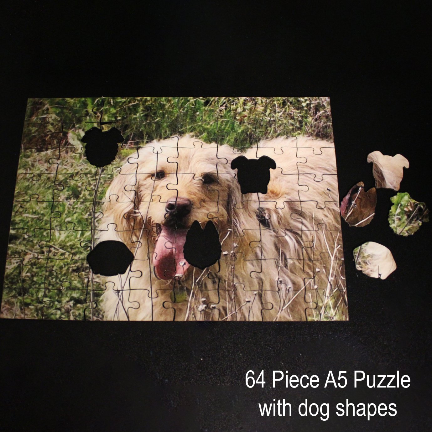Instead of standard pieces, this design features individual shapes such as dog heads, animals, planes, and other themed figures woven throughout the puzzle. These custom-shaped pieces add personality and surprise while still creating a smooth and satisfying puzzle experience.