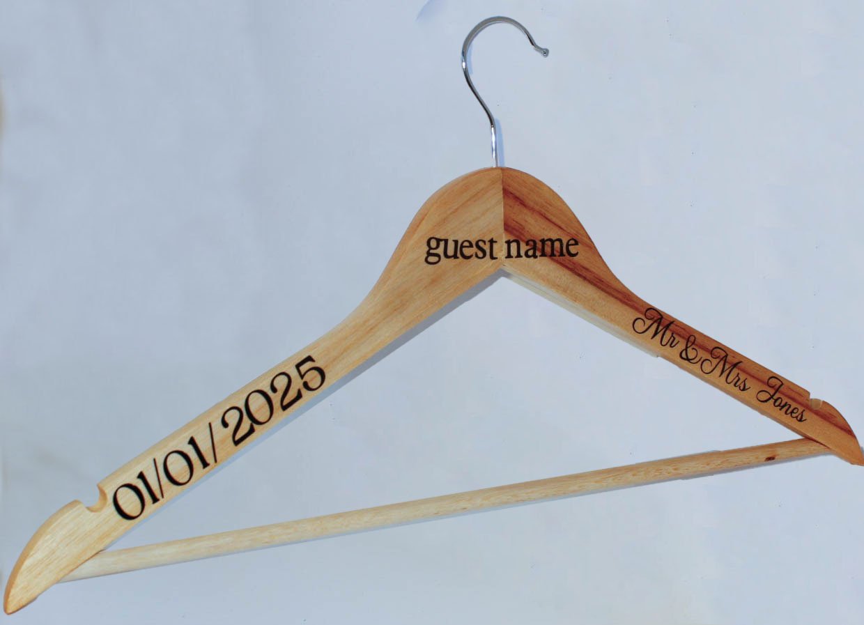 Personalisation is available in on the front of the hanger, allowing you to add names, dates, or short wording exactly where you’d like it. You can choose to have the same design mirrored on the back, or for a small additional cost, personalise the front and back differently for an extra-special finish.