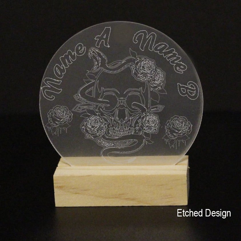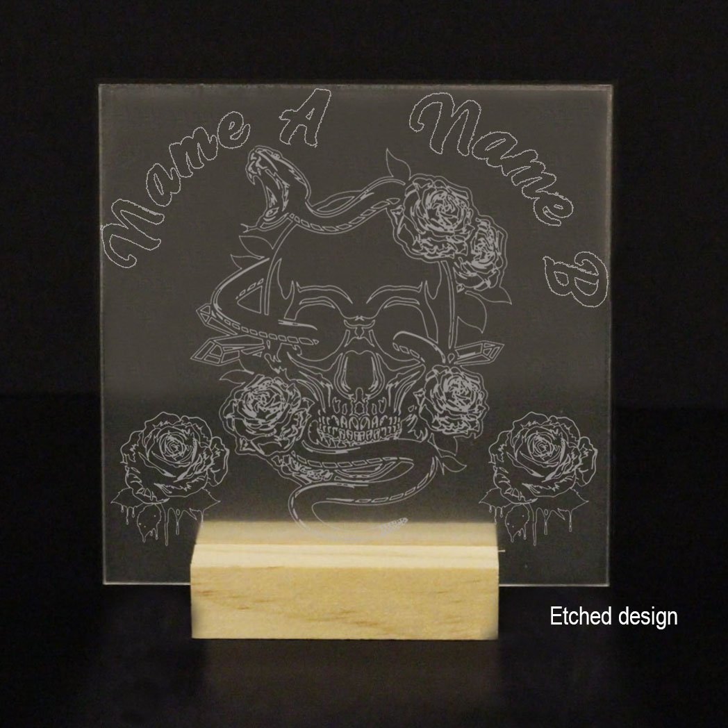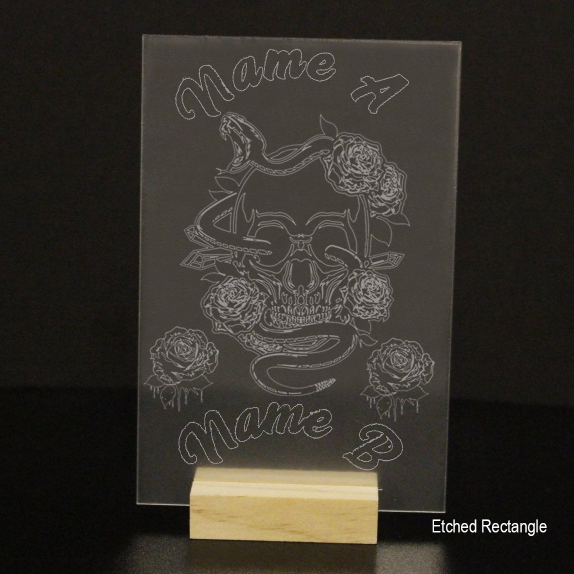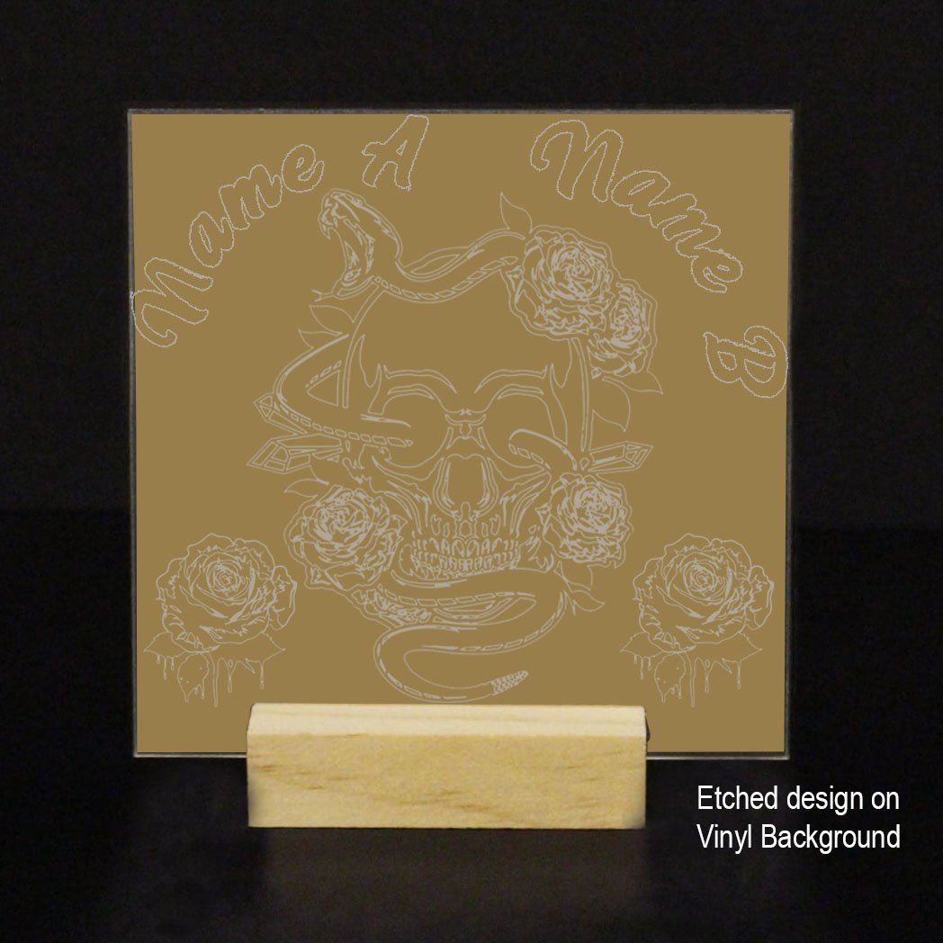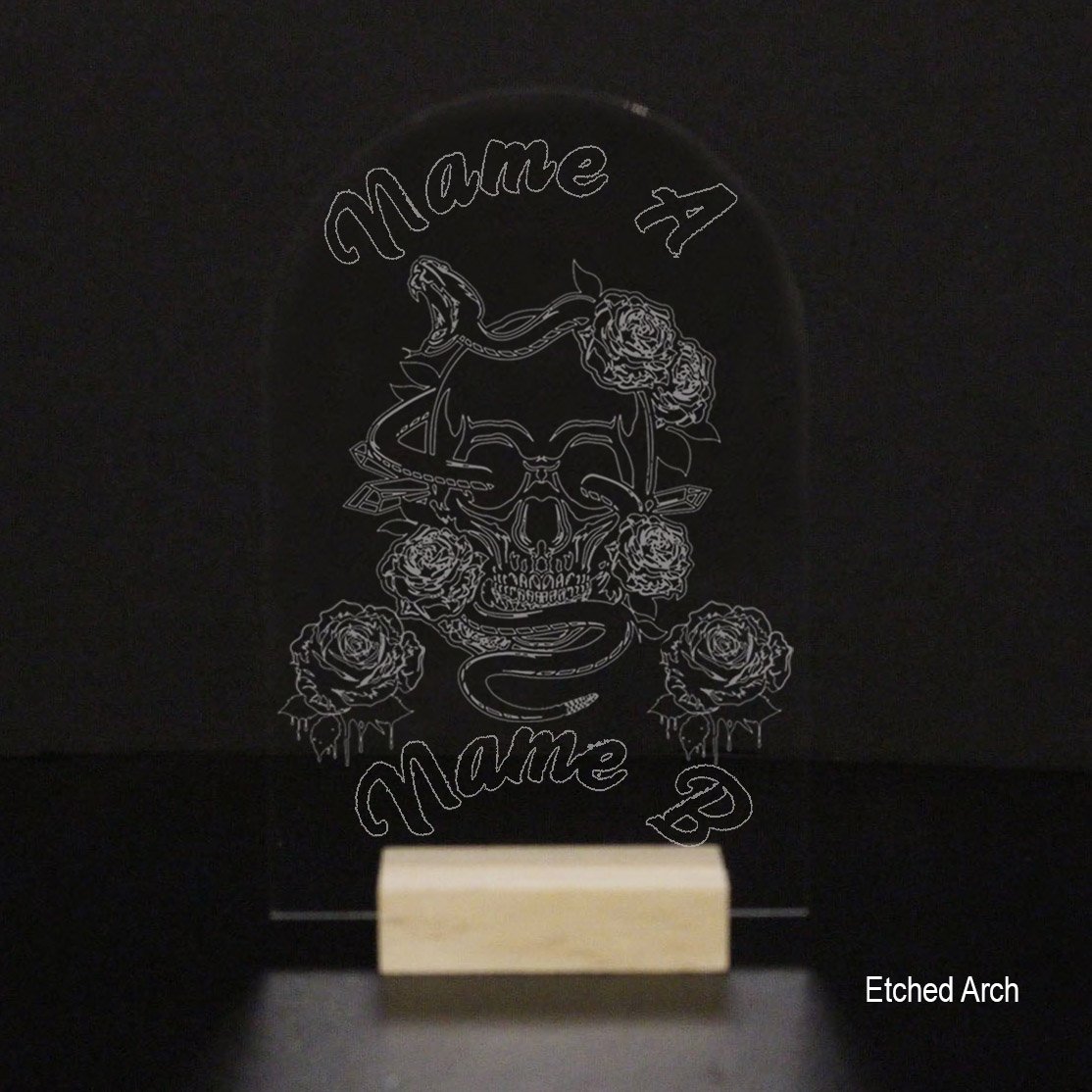 Celebrate bold, artistic style with this striking acrylic display — available as a heart, circle, square, rectangle, or arch. Featuring an intricate etching of a skull entwined with roses and serpentine detailing, it’s a captivating design that blends elegance with edge, making a dramatic statement in any space.