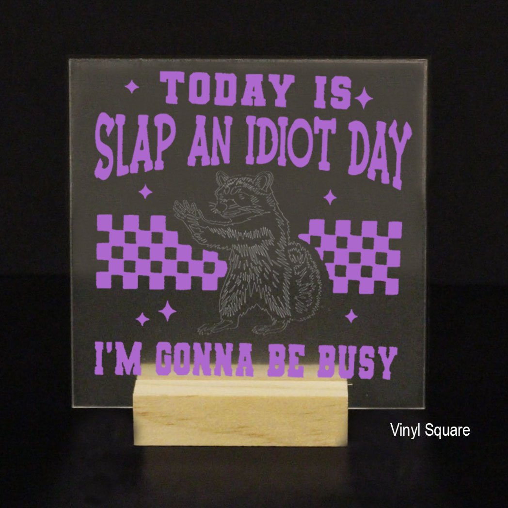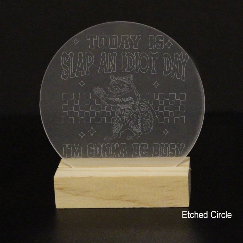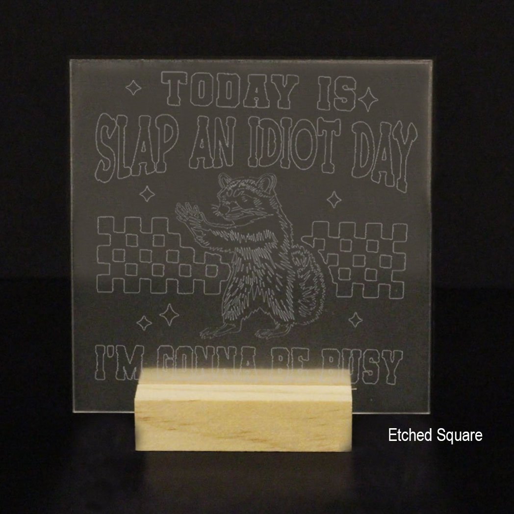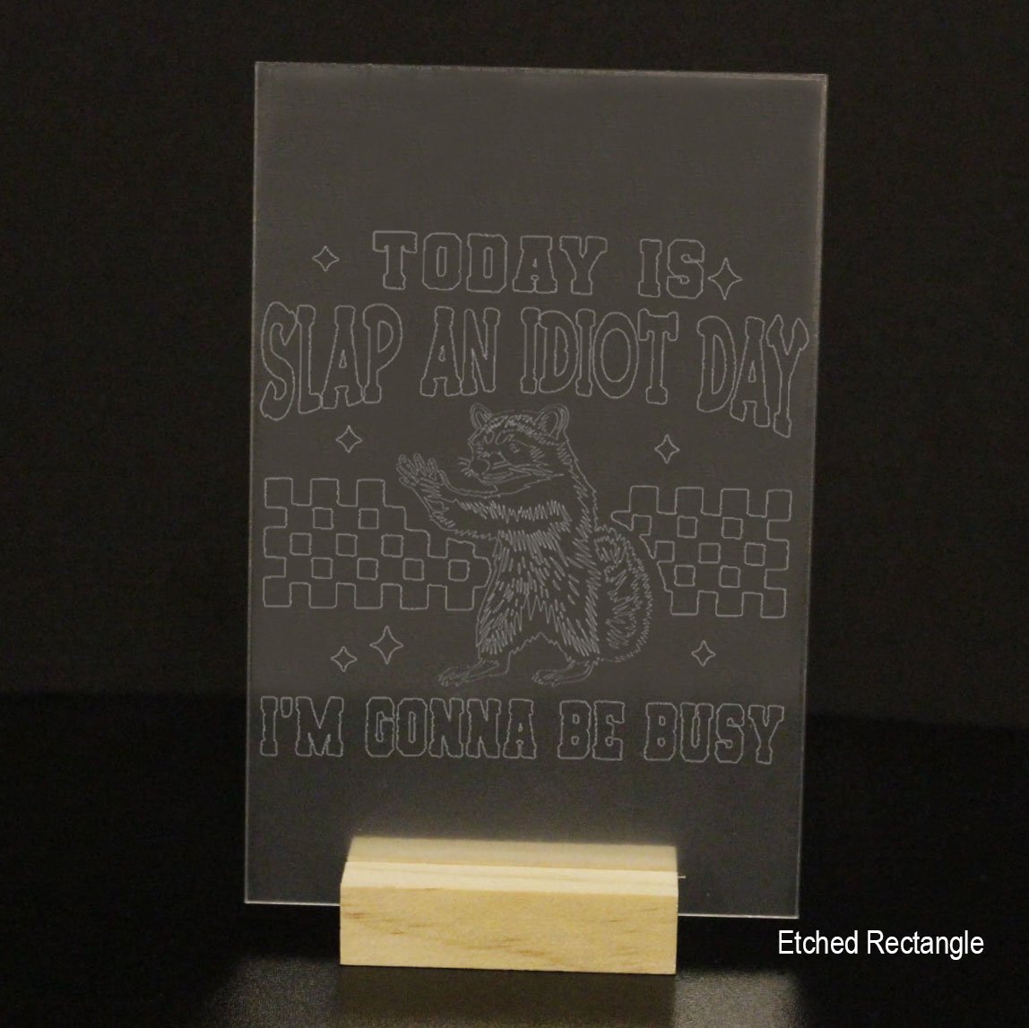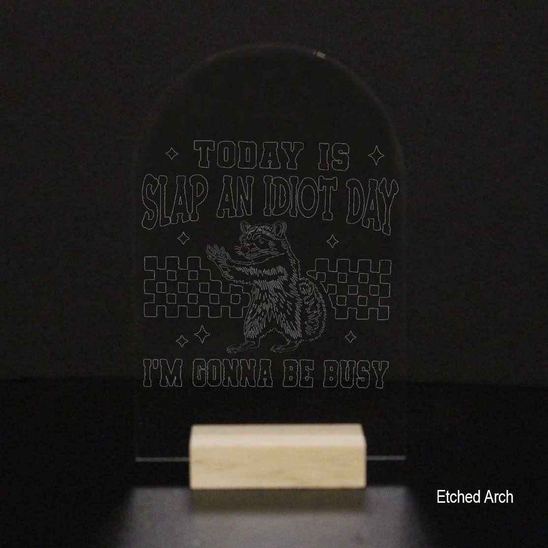 This premium acrylic display — available as a heart, circle, square, rectangle, or arch — features a playful raccoon illustration paired with a bold, tongue-in-cheek slogan that adds instant character to any desk or display. The raccoon artwork is always precision-etched for crisp, long-lasting detail and cannot be made in vinyl.