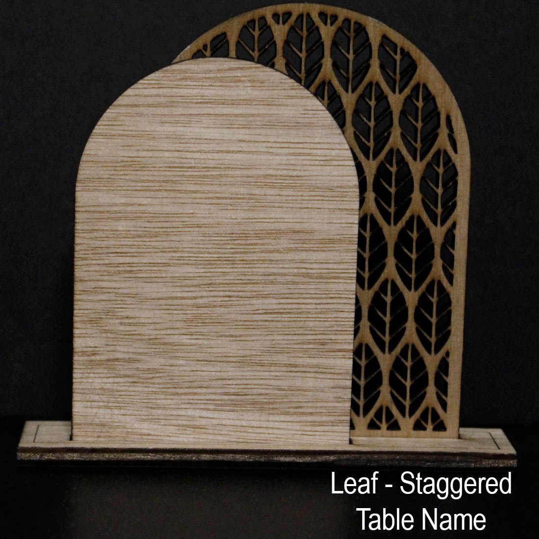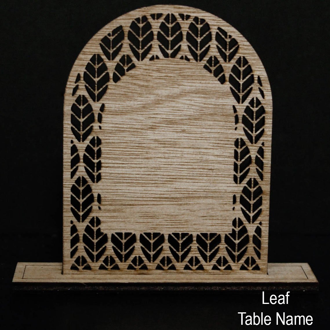 The Leaf Table Name design features flowing foliage detail that frames the arch shape, creating a natural and elegant table feature.